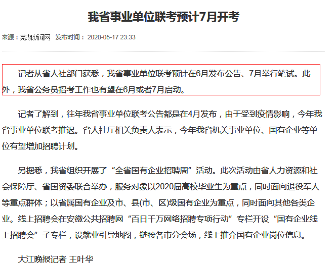 除了2020年安徽省考外,2020年安徽事業(yè)單位統(tǒng)考也將于6月發(fā)布公告,7月筆試。