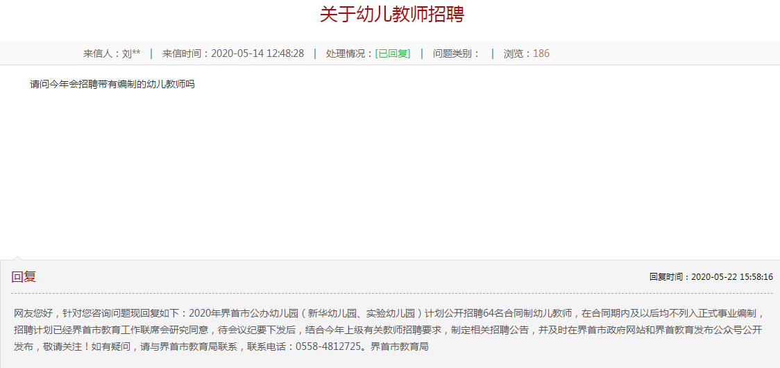 網(wǎng)友您好,針對您咨詢問題現(xiàn)回復如下:2020年界首市公辦幼兒園(新華幼兒園、實驗幼兒園)計劃公開招聘64名合同制幼兒教師,在合同期內(nèi)及以后均不列入正式事業(yè)編制,招聘計劃已經(jīng)界首市教育工作聯(lián)席會研究同意,待會議紀要下發(fā)后,結(jié)合今年上級有關教師招聘要求,制定相關招聘公告,并及時在界首市政府網(wǎng)站和界首教育發(fā)布公眾號公開發(fā)布,敬請關注!如有疑問,請與界首市教育局聯(lián)系,聯(lián)系電話:0558-4812725。界首市教育局