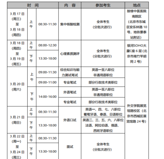 近年來,外交部的面試形式均為結(jié)構(gòu)化面試,面試時(shí)間為20-30分鐘,題量4-11題,考官讀題。除了面試之外,還需進(jìn)行相應(yīng)的專業(yè)能力測(cè)試和心理素質(zhì)測(cè)試,其中專業(yè)能力測(cè)試包括綜合知識(shí)與能力測(cè)試(筆試)、專業(yè)筆試、外語筆試、外語口試;心理素質(zhì)測(cè)試分批次進(jìn)行,不計(jì)入綜合成績(jī)。