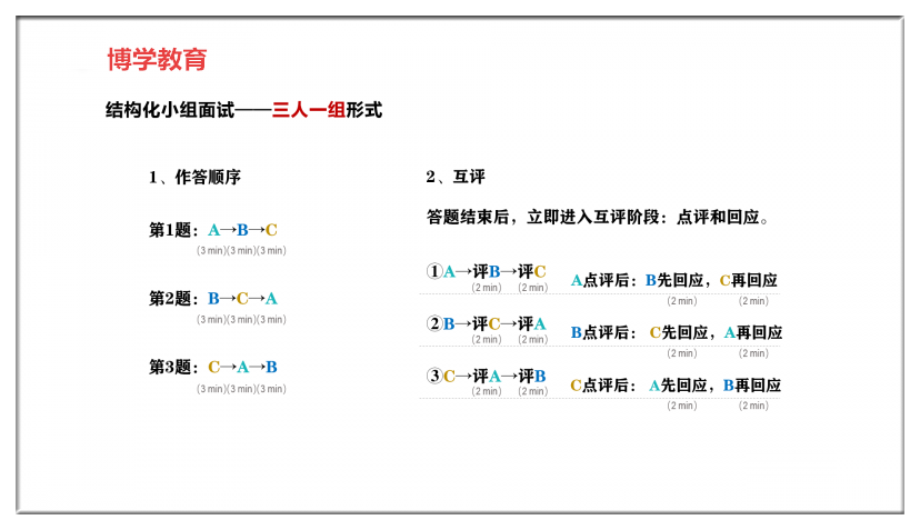 (1)結(jié)構(gòu)化小組互評:15分鐘場外備考看題,進入考場后,按要求每人依次答題,每道題目3分鐘(注:個人答題時間:2020年—2021年均為3分鐘,2018年—2019年均為2分鐘);全部答題結(jié)束,按要求展開互評,點評每人的時間為2分鐘;被點評人針對點評展開回應,時間2分鐘。