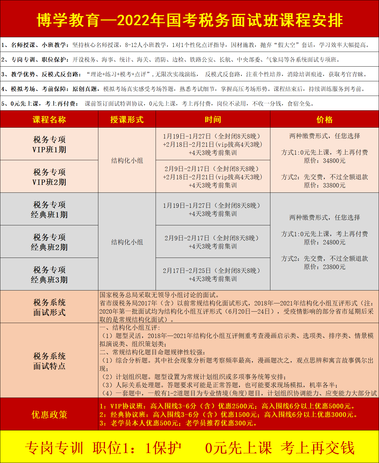 稅務局面試形式和特點 面試形式:國家稅務總局采取無領導小組討論的面試。 省市級稅務局2017年(含)以前常規(guī)結構化面試形式,2018年—2021年結構化小組互評形式(注:2020年第一批面試均為結構化小組互評形式(6月20日—24日),受疫情影響的部分省市延期后采取的是常規(guī)結構化面試)。 面試題量:結構化小組互評每套題3道題目;常規(guī)結構化面試每套題4道題目。 面試時間: (1)結構化小組互評:15分鐘場外備考看題,進入考場后,按要求每人依次答題,每道題目3分鐘(注:個人答題時間:2020年—2021年均為3分鐘,2018年—2019年均為2分鐘);全部答題結束,按要求展開互評,點評每人的時間為2分鐘;被點評人針對點評展開回應,時間2分鐘。 (2)常規(guī)結構化面試:4道題目20分鐘,剩余3分鐘提醒時間。 (3)無領導討論:20分鐘場外備考看材料,然后進入考場總時間85分鐘,首先個人陳述每人3分鐘,然后根據(jù)問題展開自由討論,最后推選一個代表作5分鐘陳述總結。 考查方式:看題+聽題相結合的 面試試題特點 第一、結構化小組互評: (1)題型靈活,2018年—2021年結構化小組互評側重考查漫畫啟示類、選項類、排序類、情景模擬演說類、組織策劃類; 第二、常規(guī)結構化題目命題規(guī)律性較強: (1)綜合分析題。其中社會現(xiàn)象分析題考察頻率最高,漫畫題次之,觀點思辨和寓言故事偶爾出現(xiàn); (2)計劃組織題。題型設置為常規(guī)計劃組織或多項事務統(tǒng)籌安排; (3)人際關系處理題。答題要求可能是正常答題,也可能要求現(xiàn)場模擬,機率各半; (4)一套題中,一般有1-2道題目為專業(yè)情境(角度)題目,計劃組織協(xié)調(diào)能力、應變能力大部分試題為國稅專業(yè)情境題,綜合分析有少量的國稅專業(yè)角度題目,總體難度不大。
