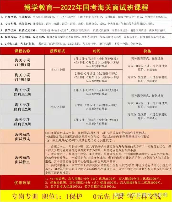 面試形式:2021年面試形式大變革,首批面試3月20日—3月23日采取的是結(jié)構(gòu)化小組形式;補(bǔ)錄面試6月20日采取的是常規(guī)結(jié)構(gòu)化形式。在此之前的年份均是常規(guī)結(jié)構(gòu)化面試(注:除上海海關(guān)2020年采取的也是結(jié)構(gòu)化小組形式)。