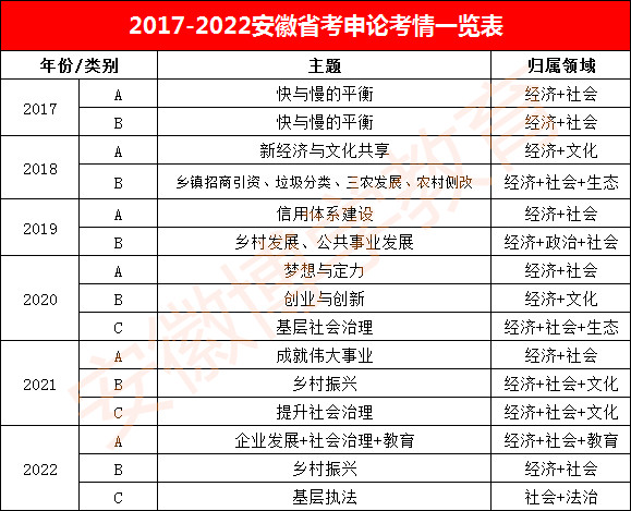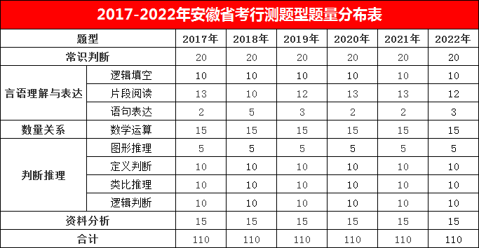 2016-2022年安徽省考行測(cè)題型題量分布表