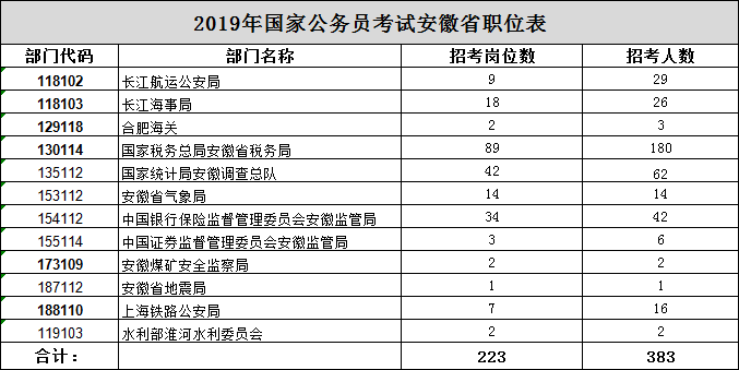 2019國家公務(wù)員考試職位表(安徽招383人,共223個(gè)崗位) |