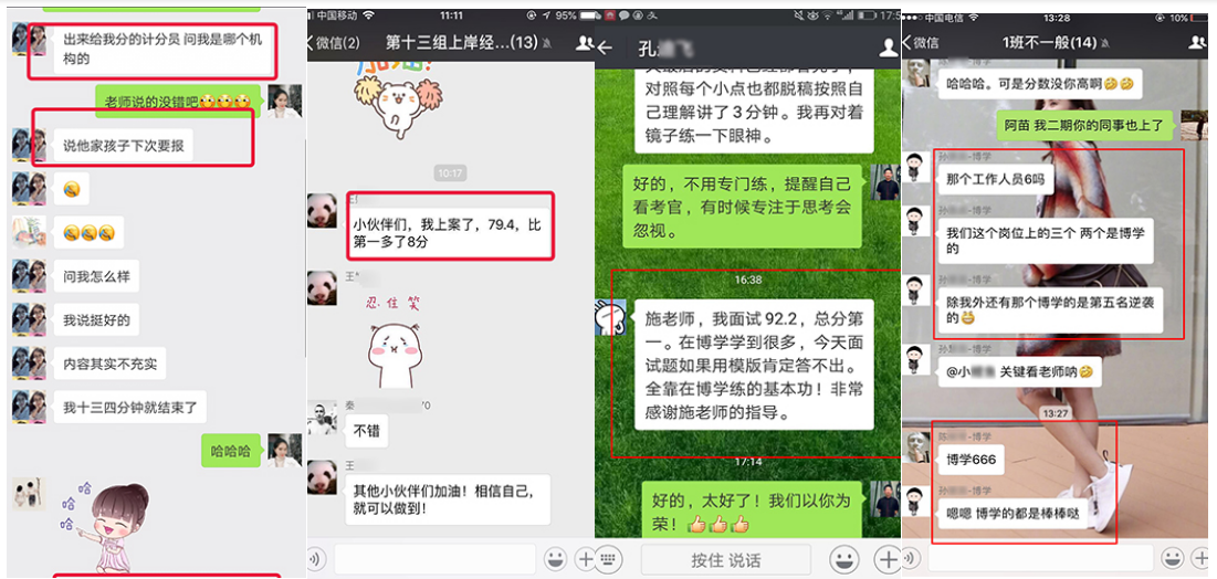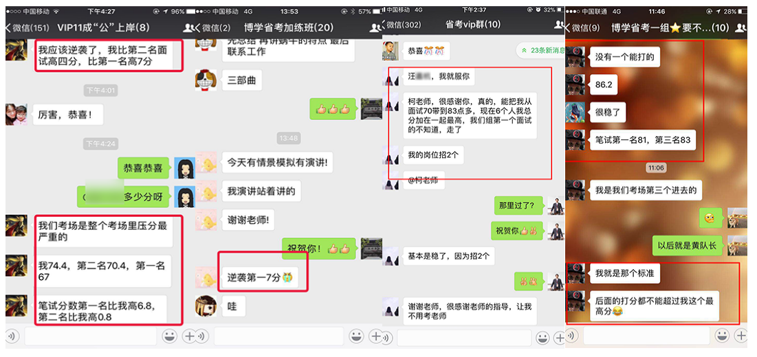 在2010年—2018年國考中,很多人僅僅是因?yàn)榭戳司W(wǎng)上博學(xué)教育公務(wù)員班的幾段視頻,就毫不猶豫地選擇博學(xué)教育,最終成功地實(shí)現(xiàn)了他們的公務(wù)員之夢(mèng)。2010年安徽省考高陽同學(xué)面試取得88.4的高分,一舉從筆試第23名躍居為綜合排名第一名,成為巢湖市面試狀元;胡卓然同學(xué)以86分的成績(jī)勇奪南京市第一名,被南京市國土資源局錄取。廣東的鄭滋潤(rùn)同學(xué),數(shù)次公考面試失敗,2011年慕名來到博學(xué)施老師門下,經(jīng)過七天學(xué)習(xí),脫胎換骨,以91分的成績(jī)遙遙領(lǐng)先對(duì)手被財(cái)政部駐深圳市專員辦錄??!2011年安徽省考季毓同學(xué)面試取得88的高分,成為馬鞍市面試狀元;2012年上海的潘安安同學(xué),以88.3的高分被上海海關(guān)隸屬海關(guān)通關(guān)業(yè)務(wù)部門錄取。2013年福建的王子熙同學(xué),以89.4的高分被廈門海關(guān)廈門地區(qū)隸屬海關(guān)或辦事處錄取。2013年安徽省考牛園園同學(xué)取得面試86.8分,成為亳州市面試狀元!2014年安徽的曹珍同學(xué),以86.8的成績(jī)勇奪安徽省直面試狀元,被安徽省女子監(jiān)獄錄取。2015年國考安徽的曹燦同學(xué),以92.25分的成績(jī)被中國銀行業(yè)監(jiān)督管理委員會(huì)安徽監(jiān)管局錄?。?015年安徽省考陳雯同學(xué)以面試87.2的高分勇奪蕪湖市面試狀元;趙錦同學(xué)以面試86.4的高分取得天長(zhǎng)市面試狀元;查菁文同學(xué)以面試86的高分取得定遠(yuǎn)縣面試狀元。2016年國考面試,張雨豪以91分的成績(jī)被甘肅省國家稅務(wù)局錄取。2016年安徽省考陳蓉同學(xué)以面試86.8分取得馬鞍山市非鄉(xiāng)鎮(zhèn)公務(wù)員面試狀元;2017年國考,劉大偉勇奪山東省面試狀元,以98.67分被商務(wù)部錄取;阮帆同學(xué)面試取得91.33分,上海市國稅錄?。秽嵪胪瑢W(xué)面試取得90.3分,上海國稅錄;2017年安徽省考顧博賢同學(xué)以面試88分取得利辛縣非鄉(xiāng)鎮(zhèn)公務(wù)員面試狀元。2018年國考徐起以87.33分被中央國家機(jī)關(guān)工委錄取,夏鈺以88.33分被中國浦東干部學(xué)院錄取。2018年安徽省考,周陽以83.8分取得銅陵市鄉(xiāng)鎮(zhèn)層級(jí)面試狀元;魏宇以82.8分取得亳州市鄉(xiāng)鎮(zhèn)層級(jí)面試狀元!